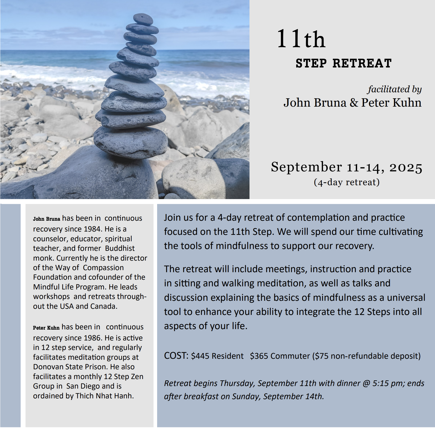 Back to All Events 11th Step Retreat Thursday, September 11, 2025 5:15 PM Sunday, September 14, 2025 10:00 AM Google Calendar ICS Click to Register